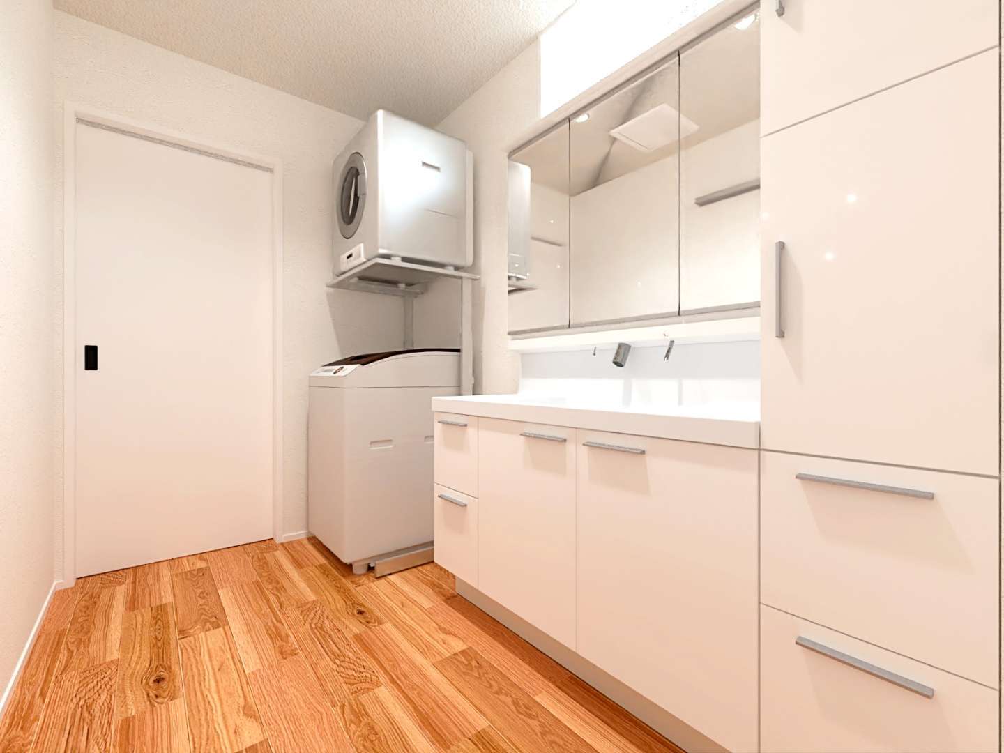 引き戸の先はキッチンにつながっており、移動もしやすい間取りです。ガス乾燥機「乾太くん」は標準装備。毎日の洗濯も快適です。