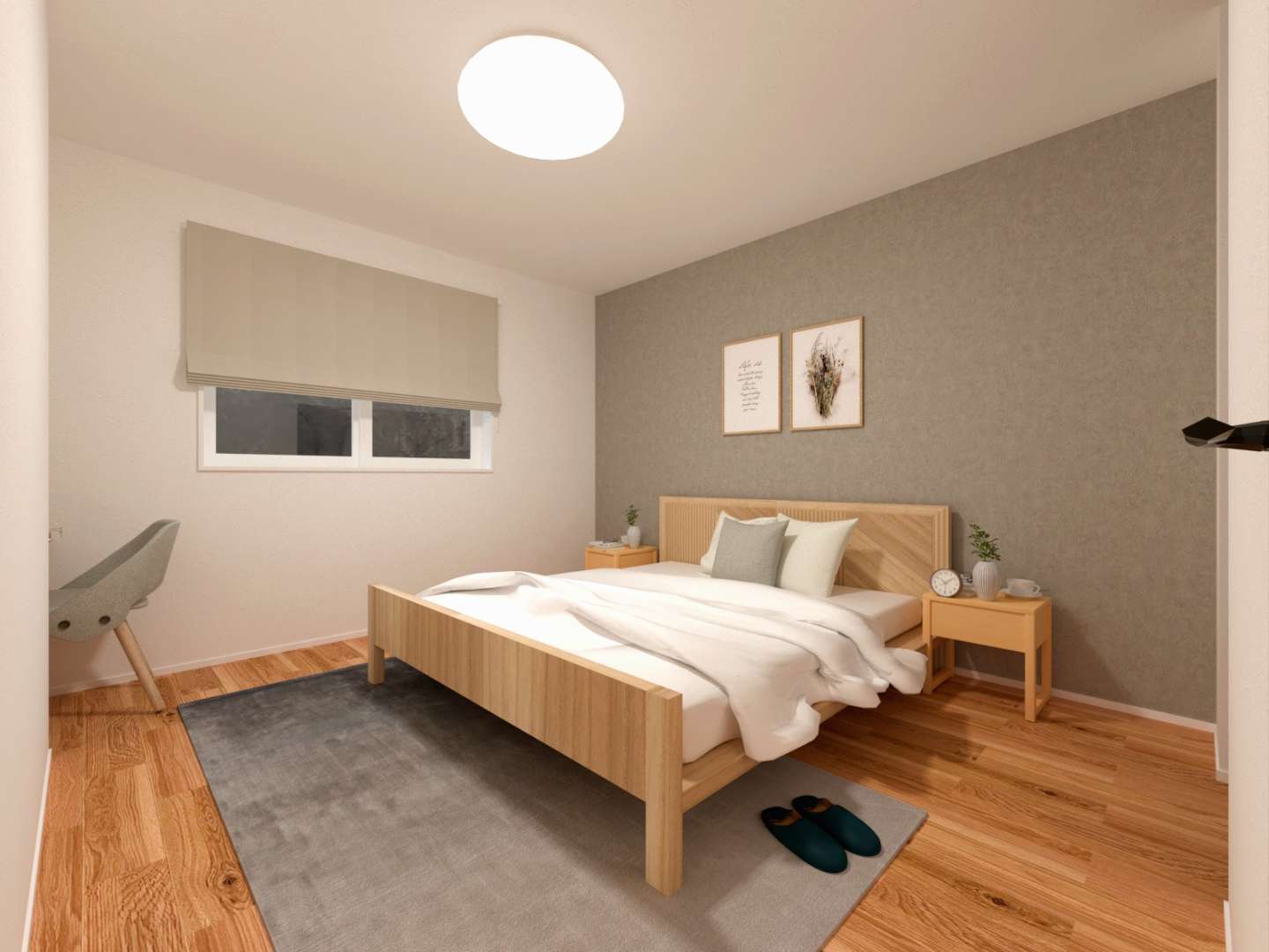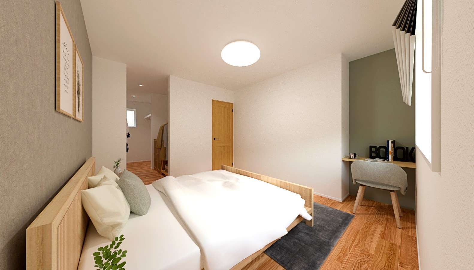 主寝室にはカウンタースペースを設けているので、ちょっとした作業や身支度にも便利です。4帖の広さがあるWICは収納力もしっかり。整理ダンスを置けるスペースも確保し、使いやすさにも配慮しました。