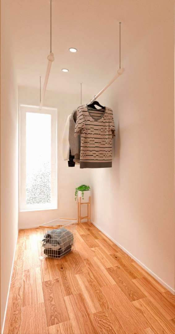 2階ホールにはドライスペースを設けました。テラスドアの先はバルコニーになっており、外干し派の方にも安心の設計です。