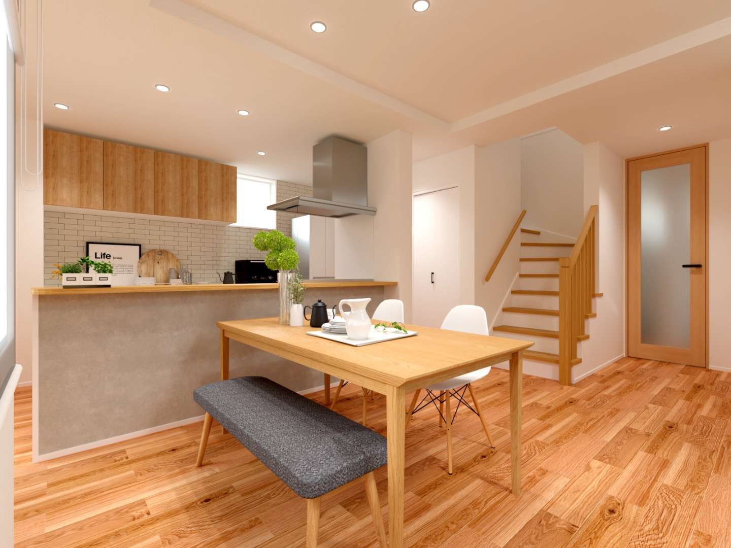 キッチンは、ぐるりと回遊できる配置。毎日の家事がスムーズに進む、うれしい動線設計です。キッチンや食器棚の扉には、リアルな木目が美しいライトグレインをセレクトしました。タイル調のアクセントクロスを取り入れ、ナチュラルなカフェのような空間をイメージしています。