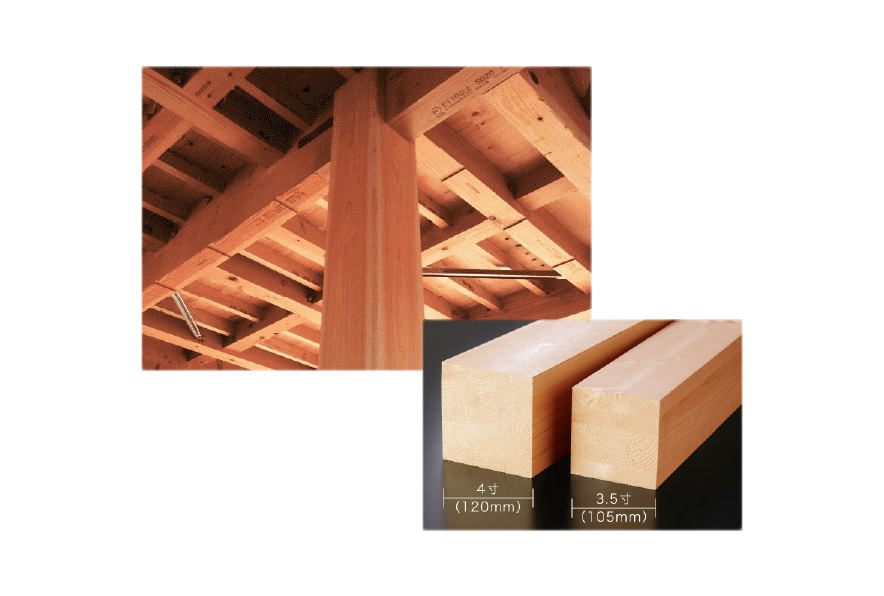 最新技術の制震と伝統的な木造軸組構造を融合させることで、1棟ごとにベストな基礎設計と軸組を行なっております。設計の自由度を高い水準で確保しつつ、強靭な構造躯体で安全・安心な住まいをお作りできるのが強みです。大東建設では土台は檜、柱は杉、梁は米松使用です。柱は4寸(12センチ)角の太さで、土台や梁もそれに合わせて太く設計しています。さらに耐震性を高めるため細かい木組みを行なっており、一般的な木造住宅と比べて、約1.25倍の木材を使用しております。また、大東建設が作る住宅の耐震性は、国が定めた住宅性能表示制度で最高ランクである、等級3を取得しております。