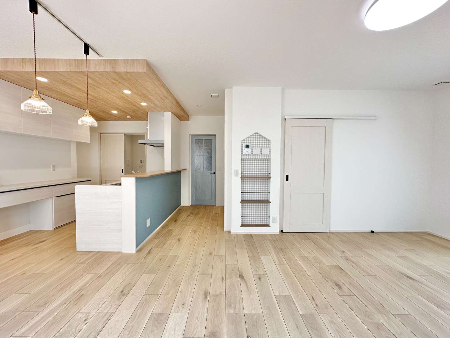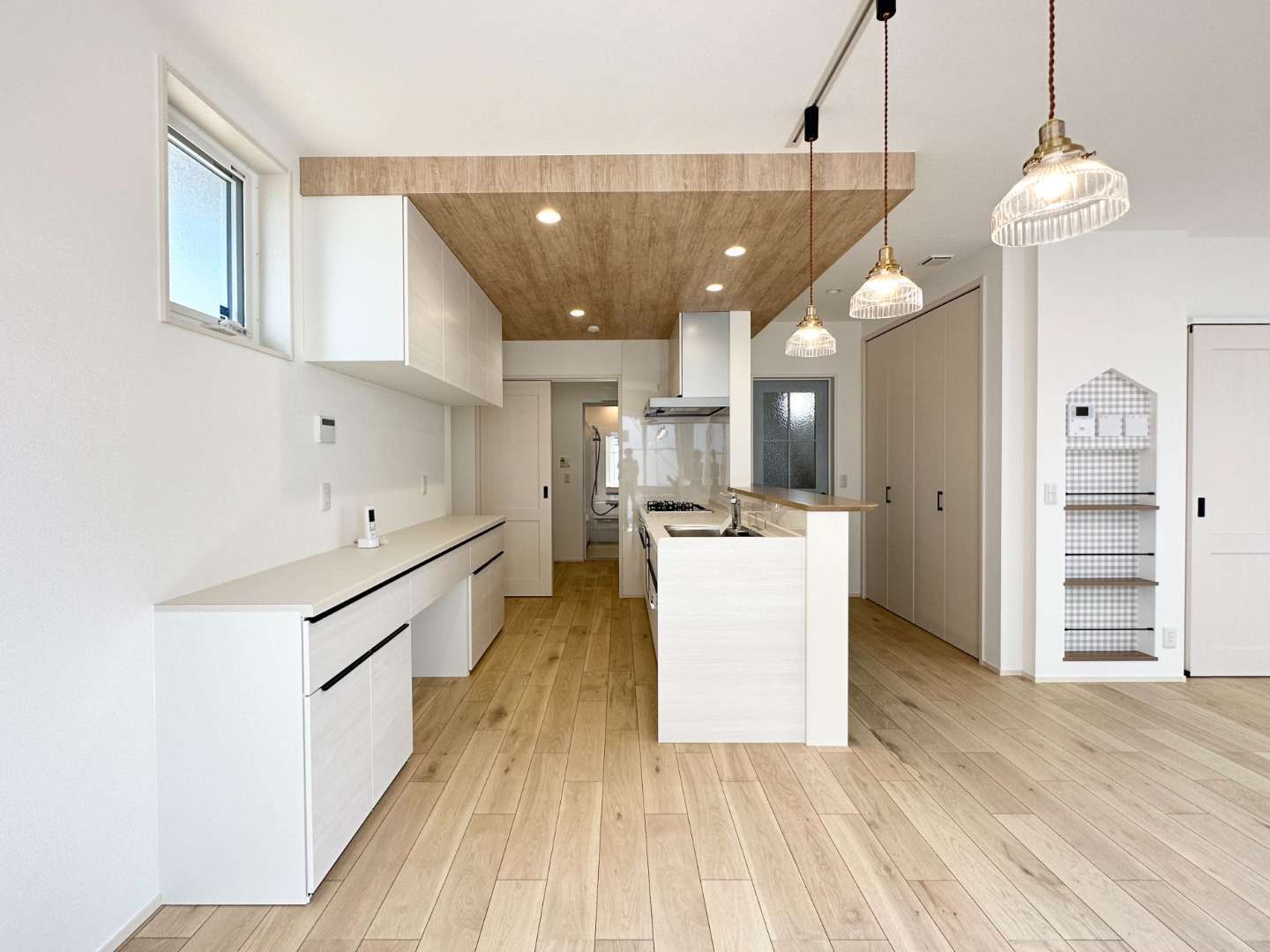 #4LDK #リビング収納 #家事楽動線 #横並びダイニング #回遊動線 #フレンチスタイル #スイッチニッチ #リモコンニッチ #壁面収納 #木目天井 #木目調クロス #収納多め